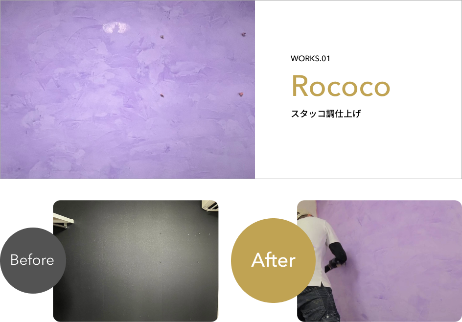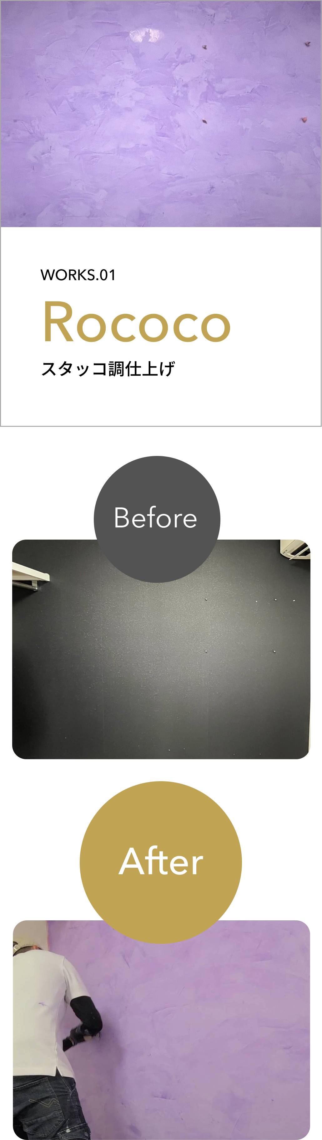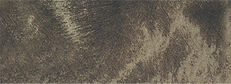 サビ調仕上げ鈍い金や銀、酸化した鉄材のような屋内塗料。鍛造された貴重な金属チップが含まれていると塗膜の表面は、ゴールドやシルバーの輝きでサビの風合いを表現し、コンテンポラリーな空間へと彩る。